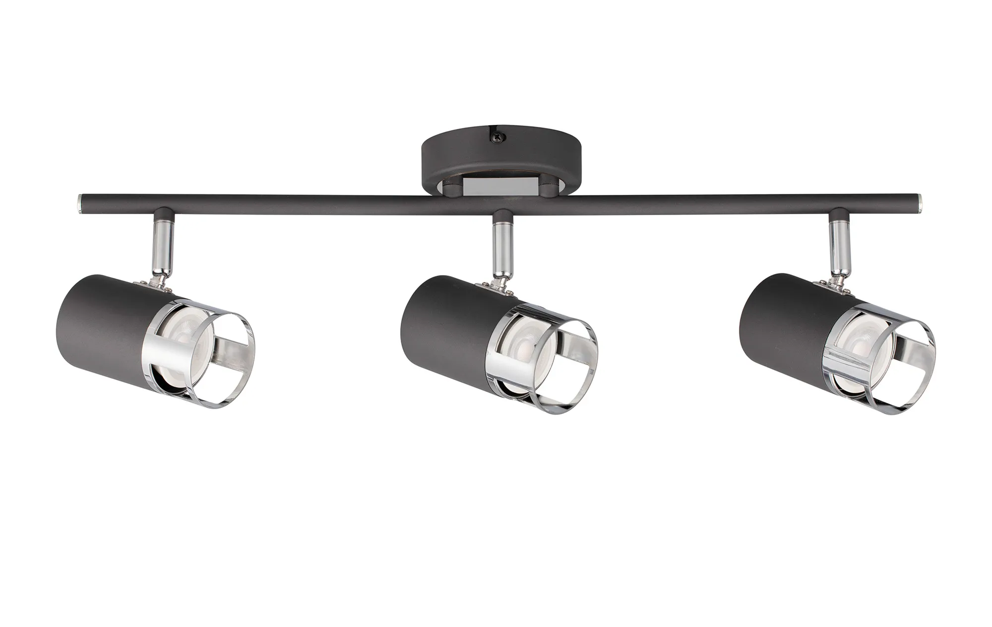 This 3 Light Spot light combines either a black colour finish with painted gold components or a graphite finish with polished chrome accents for a decorative visual contrast. In a variation of linear and round fixtures, it is a chic range adaptable to a wide range of internal settings and décor. Sleek cylindrical shapes house the GU10 lamp holders projecting a downward distribution of light.